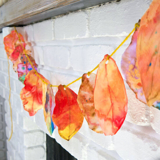 А вот эта гирлянда – наша любимая! Нужно только собрать листьев и аккуратно нанизать на нитку. Если сделать гирлянду длинной, то она будет долго украшать класс и радовать его обитателей.