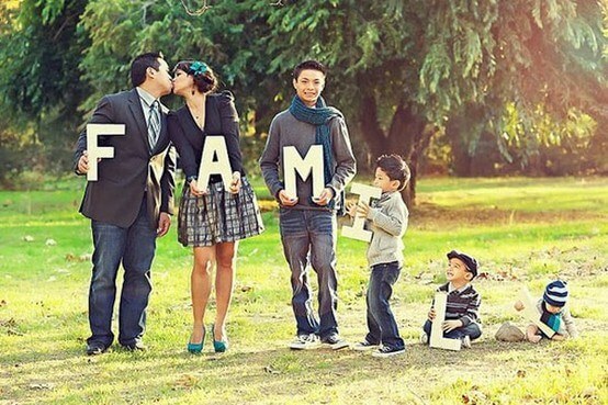 Здорово смотрятся фотографии, на которых каждый член семьи держит буковку, которые складываются в самые важные слова, например, «семья» или «любовь».